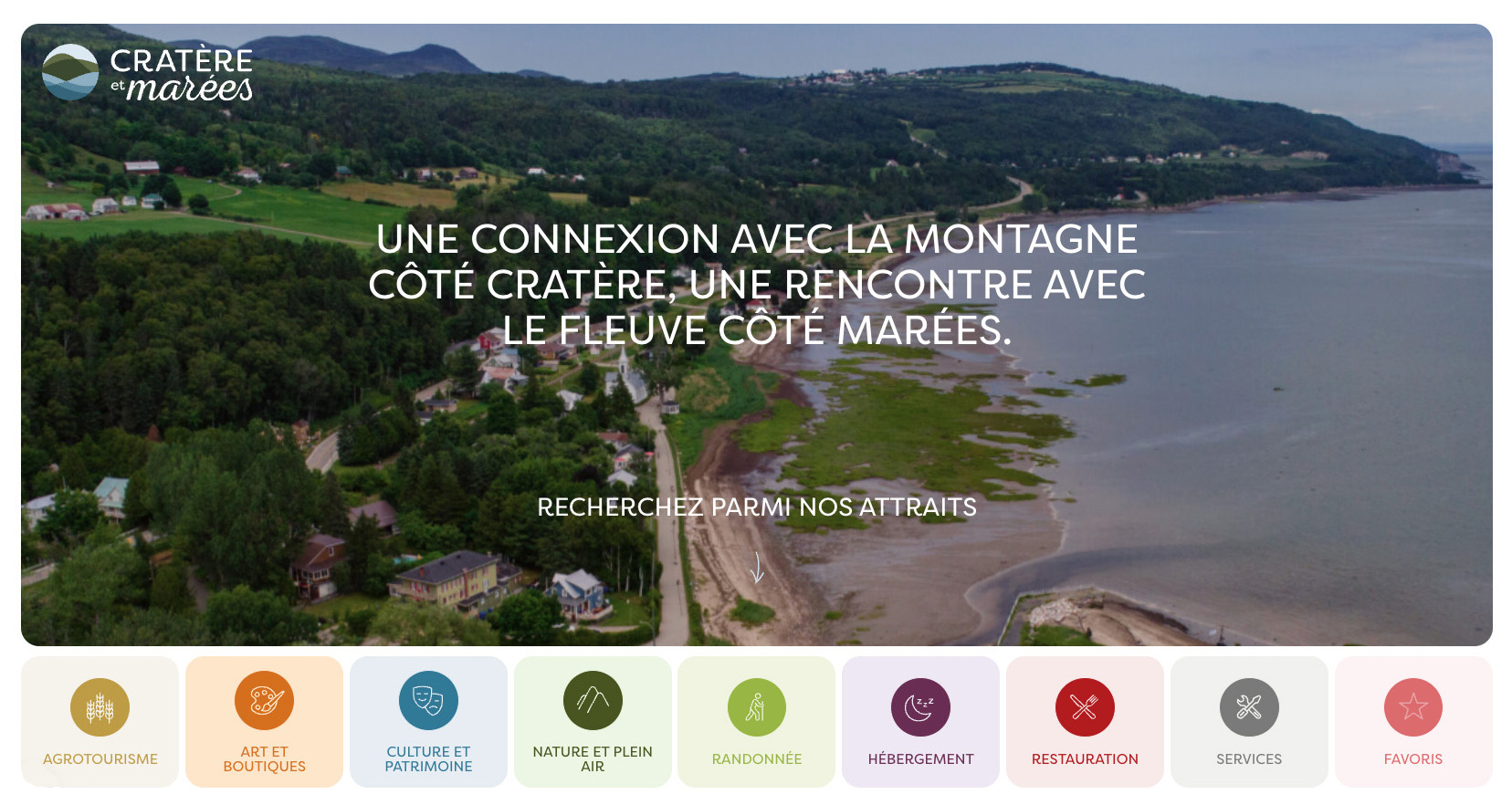Cratère et Marées est l’organisme de promotion touristique enraciné dans la communauté des Éboulements et de Saint-Irénée. À travers une carte interactive, leur site Web explore les attraits, les savoir-faire et les lieux qui font vibrer notre coin de pays. Pour découvrir les attraits, cliquer sur le lien suivant :